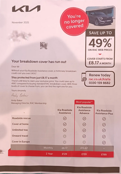 I have possessed my EV3 for somewhat more than a year and have received correspondence from Kia Roadside Assistance—managed exclusively by the RAC—regarding the renewal of my coverage at a 'Special' rate of £10.67 per month, totalling £128 annually. A brief inquiry on MoneySuperMarket for comparable breakdown coverage yielded intriguing results. Letter of Renewal The most economical yearly like-for-like coverage commences at £7.87 per year, whereas RAC annual coverage is priced at £23.99. I choose the RAC for £23.99. If European Breakdown cover was required, it incurred an additional cost of £60. Thank you, but I decline Kia Roadside Assistance; I will obtain equivalent coverage directly from the RAC and save £104 in the process.
