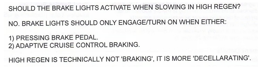 I contacted my dealer to inquire about the absence of brake lights during regenerative braking, since I had a near collision experience with a vehicle following closely behind me as I decelerated in response to a car turning in front of me. The answer provided is included as an attachment.