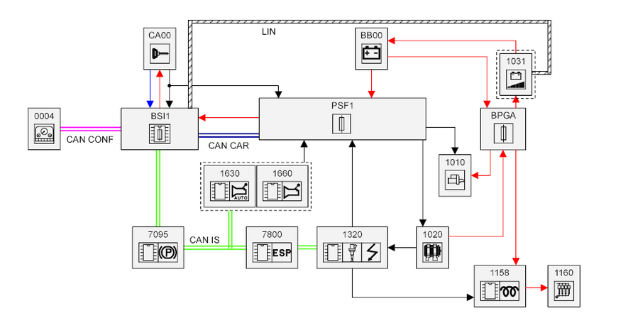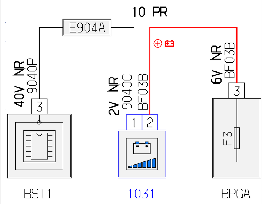 Verify that the connections to the battery and alternator are secure. F3 is functioning well and is connected to 1031. Diagnostics, such as Lexia or equivalent devices, may indicate the source of the issue, although the recommendations are speculative at this juncture.