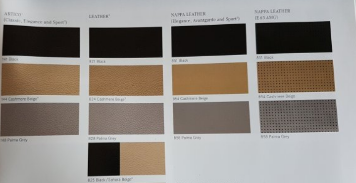 I acquired an authentic sales brochure for the W211 E-Class model from a fellow member of an online forum during my diligent pursuit of obtaining a W211 vehicle. I ultimately acquired the W212 model as a result of limited availability of satisfactory automobile options throughout the period spanning from mid-2019 to early 2020. The following compilation presents an exhaustive list of available leather alternatives along with their respective codes.