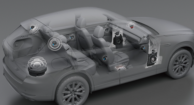 BOSE premium sound system The Mazda CX-60 has a distinctive 12-speaker Bose sound system that stands out for its exceptional appearance and outstanding performance. The Bose BassMatch engineering approach is taken to a higher level, delivering a robust listening experience with profound, low-frequency impact for everyone present. The central component of the system is a Bose digital amplifier with nine channels of customised equalisation and digital signal processing. It is situated beneath the front seat on the right-hand side. The amplifier incorporates advanced technologies such as Bose Centerpoint 2 surround sound, Bose SurroundStage processing, and Bose AudioPilot 2 noise-compensation. The 12 speakers are designed for great performance. The instrument panel is equipped with a single 80 mm Twiddler. Each door mirror patch has a 25 mm neodymium tweeter. The body frame incorporates two 115 mm high-excursion neodymium woofers, each housed in a purpose constructed cowl-side bass enclosure with a volume of four litres. The audio system consists of four 80 mm neodymium mid/high range speakers, with one speaker installed in each door. Additionally, there are two rear 65 mm surround speakers, with one speaker put in each C pillar. The system also includes a 130 mm neodymium woofer, housed in a custom-engineered bass enclosure with a volume of 10 litres, located in the spare wheel housing.