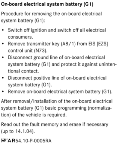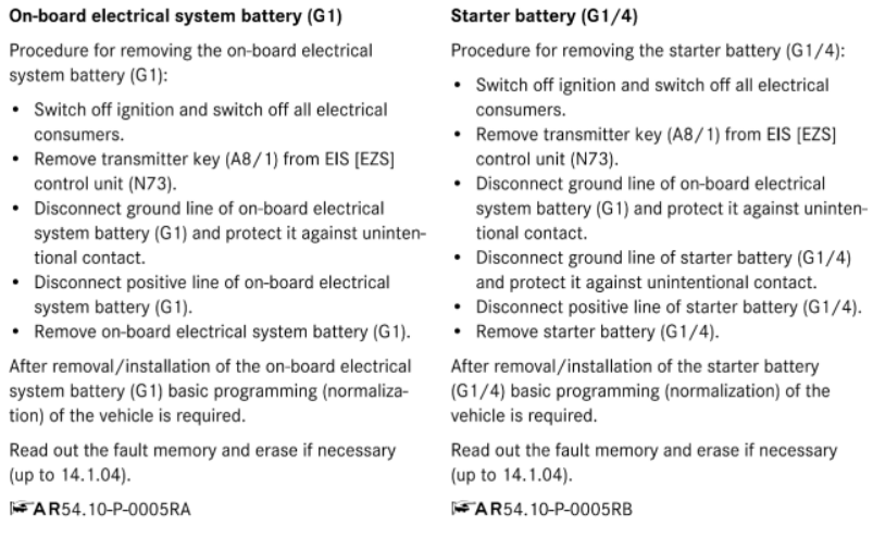 Prior to removing the front starting battery, it is important to first disconnect the rear battery negative connection. This is taken from the MB training handbook.